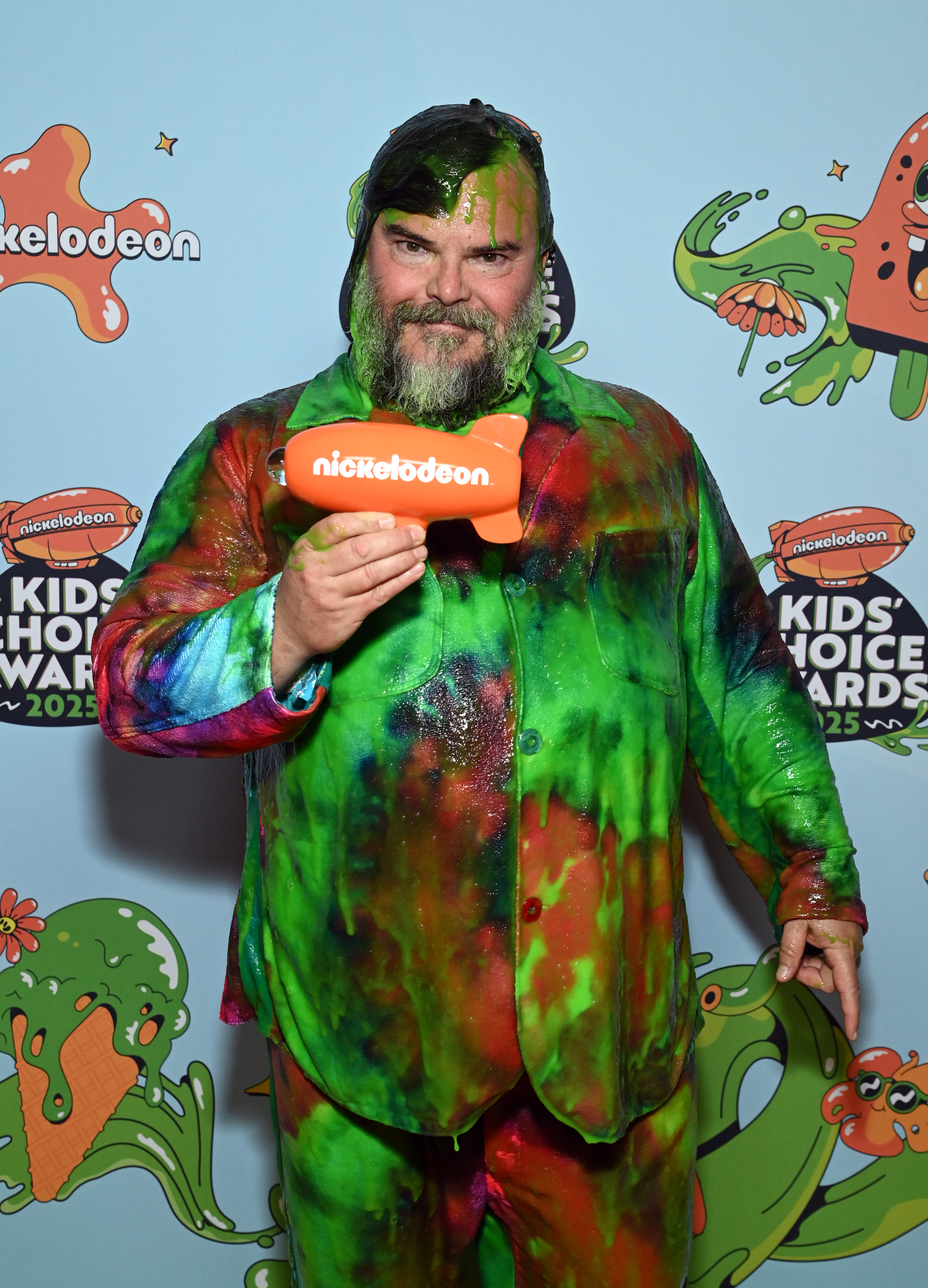SANTA MONICA, CALIFORNIA – JUNE 21: Honoree Jack Black gets slimed while accepting the King of Comedy award onstage during the Nickelodeon Kids’ Choice Awards 2025 at Barker Hangar on June 21, 2025 in Santa Monica, California. (Photo by Phillip Faraone/Getty Images for Nickelodeon)
